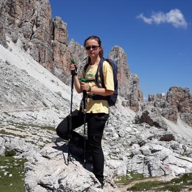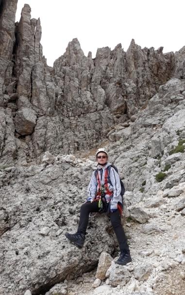 Irene verso il Rifugio Lagazuoi a 2752 m. Dalla vetta, sullo sfondo la vista sulle Cime di Cortina, poi la discesa al Passo del Falzarego all'interno della famosa galleria.