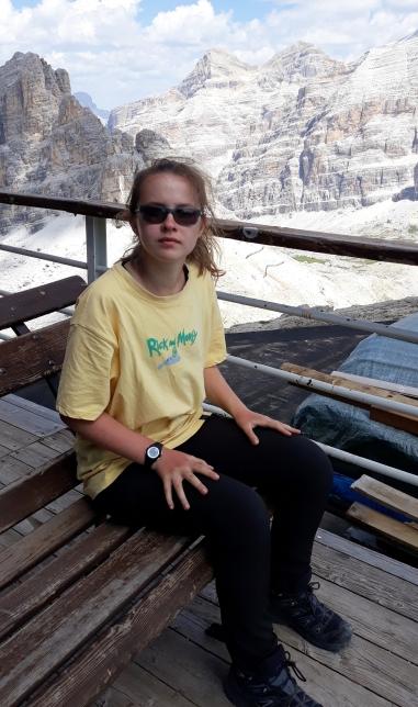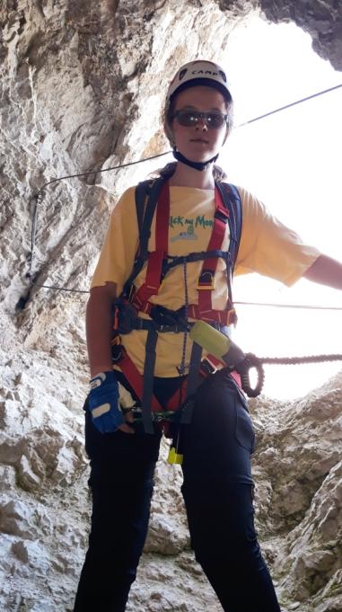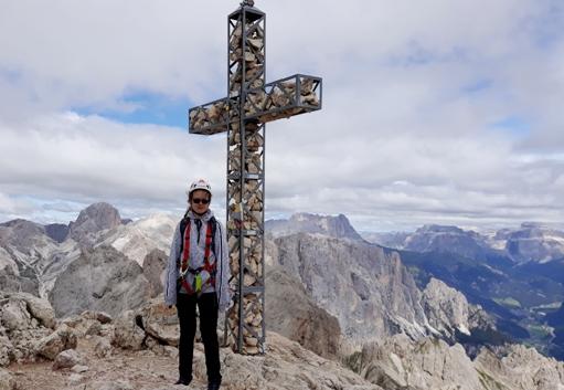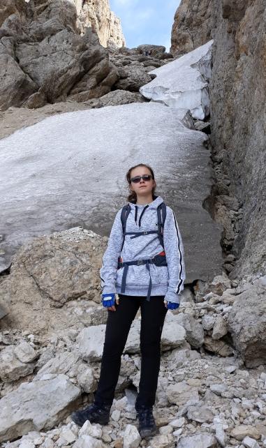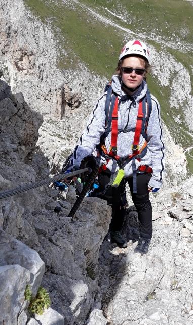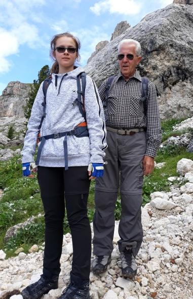 Irene, con nonno Andrea, verso la Cima della Roda di Vael a 2806 m. Foto sotto, Irene alla Croce di Vetta.