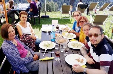In basso, pic-nic nella festività di Ferragosto al Passo Rolle e nella Foresta di Paneveggio nel Gruppo delle Pale di San Martino.